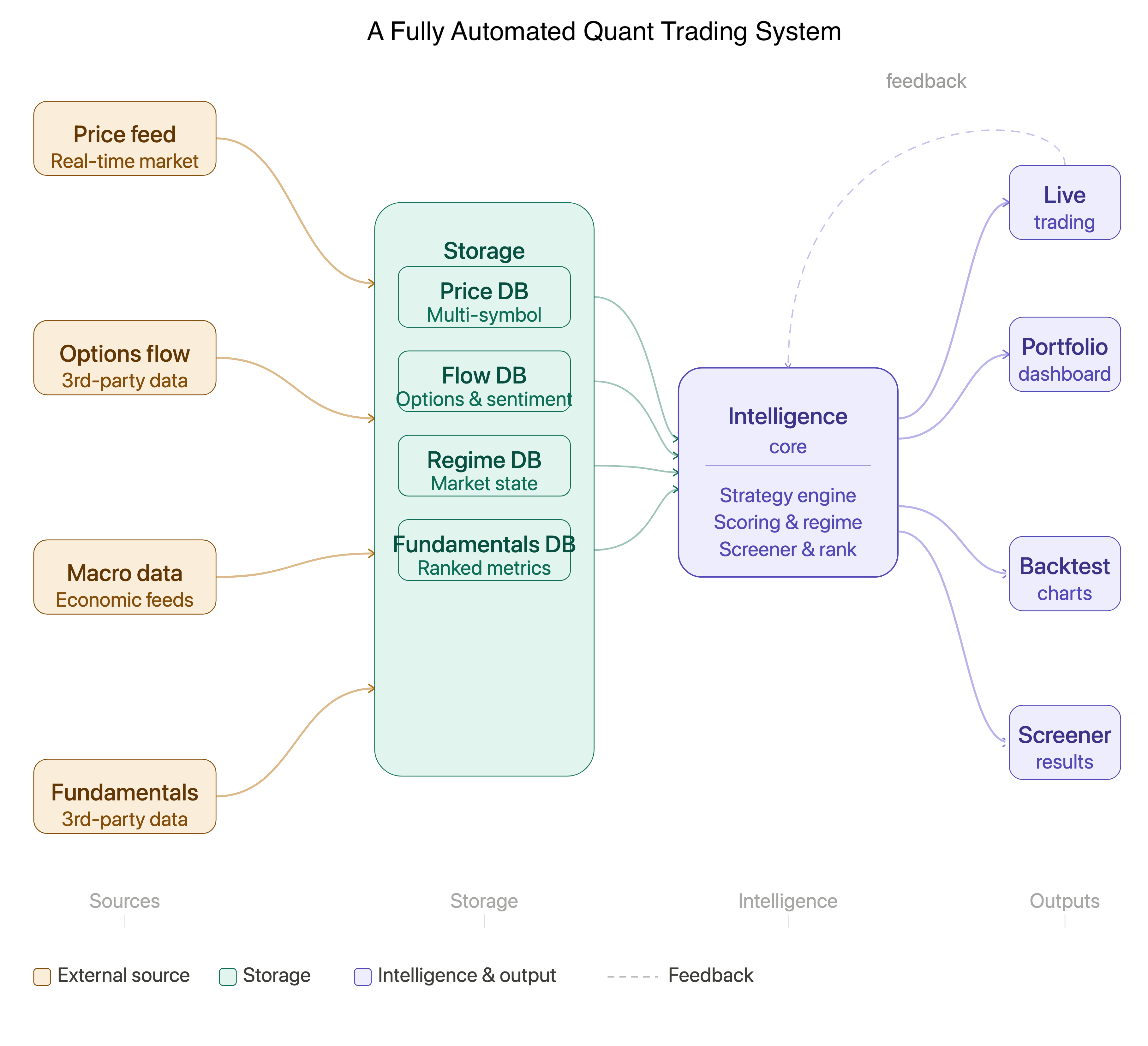 AI agents form the interpretive layer that sits above this engine. They read the market: identifying regime shifts, scoring signal quality, assessing macro conditions, and evaluating portfolio outcomes. Their role is to oversee the deterministic process — not to override it.